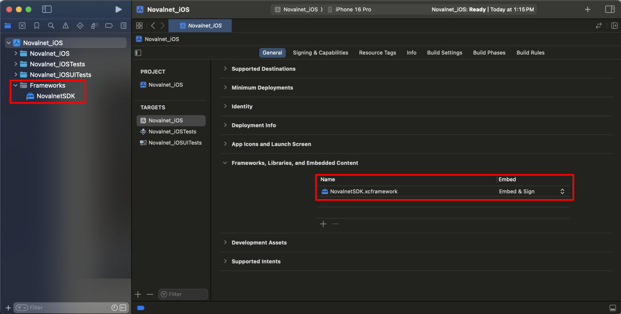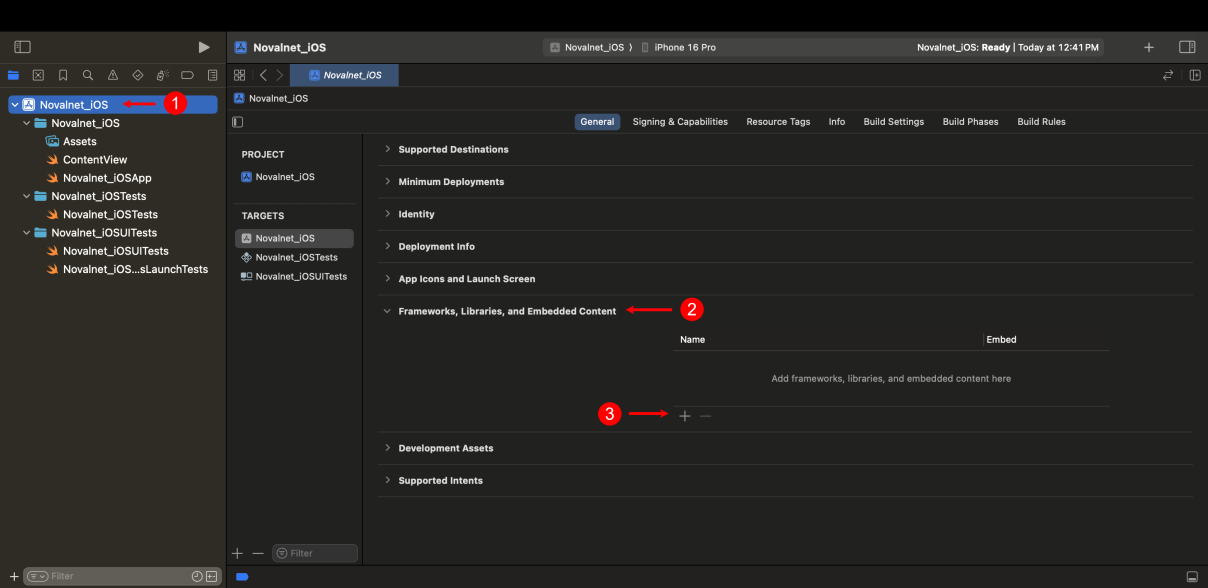 Step 3: To add the Novalnet iOS framework, navigate to the app name, e.g., Novalnet_iOS → Frameworks, Libraries, and Embedded Content. Click icon as shown below
