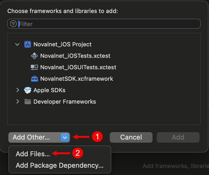 Step 4: To add a Novalnet framework, navigate to Add Other → Add Files… as shown below