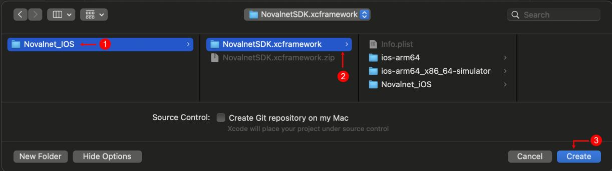 Step 5: Navigate to the extracted package NovalnetSDK.xcframework and click Create, as shown below
