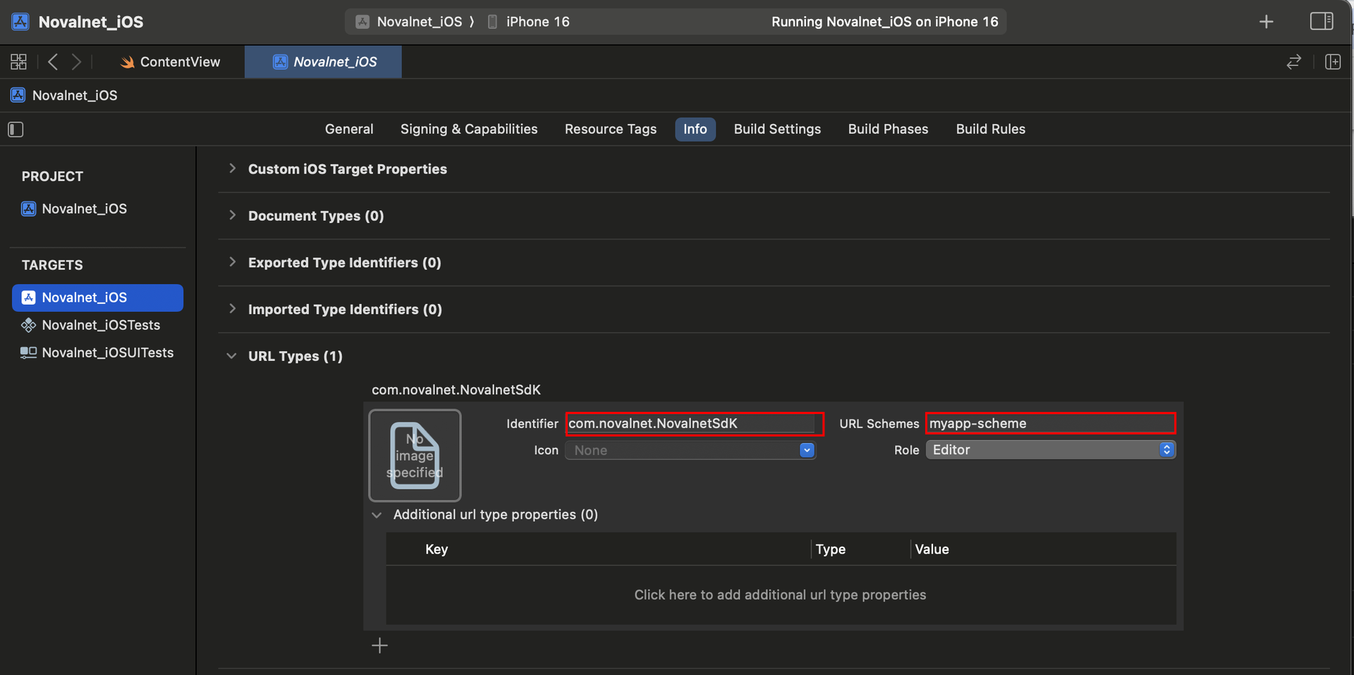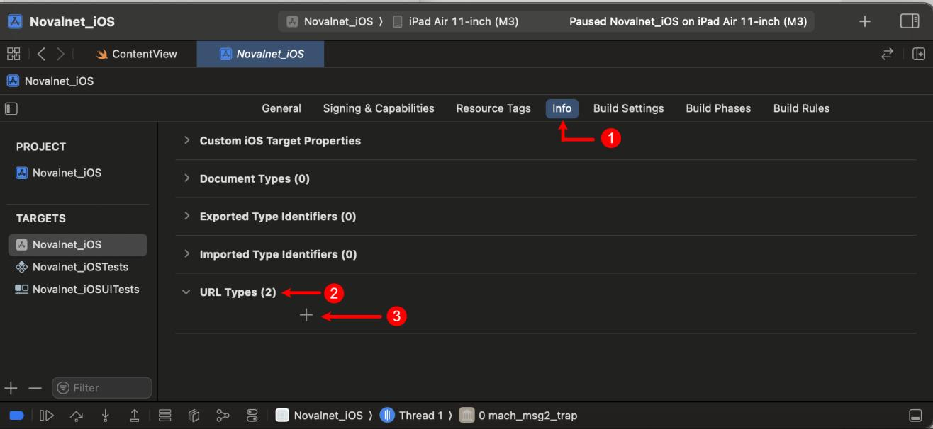 Step 1: To define a custom URL scheme, navigate to Info → URL Types and click icon as shown below